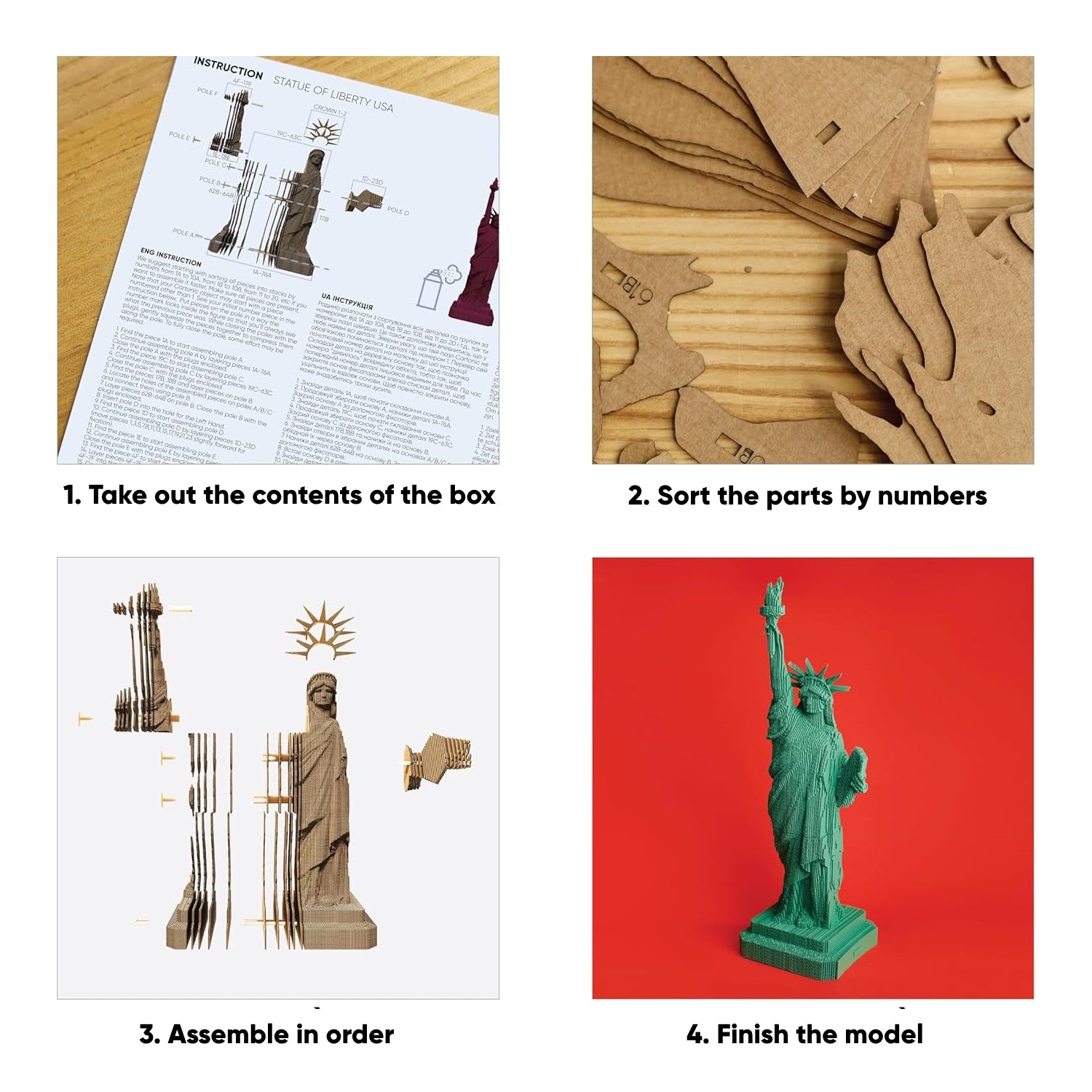 Meet the symbol of freedom and democracy — the STATUE OF LIBERTY USA, where the torch in the Statue's hand symbolizes light and enlightenment, and the crown with 7 rays represents the 7 continents and 7 seas. Assemble your own miniature Statue of Liberty. Leave it in its natural color or paint and make it unique — it's your choice. Cartonic — transform cardboard into genuine ART!